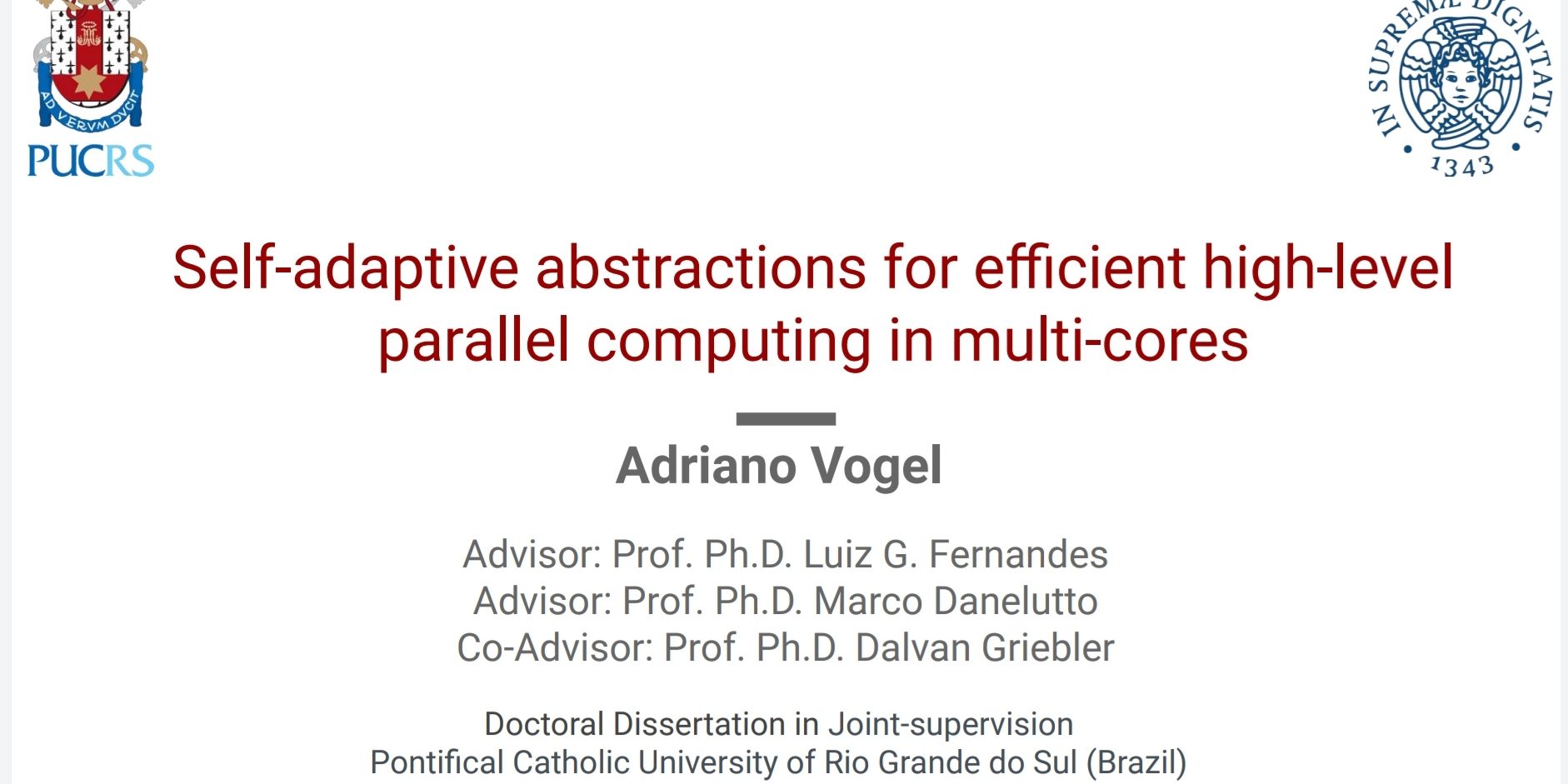 No dia 21 de março, Adriano Vogel (pesquisador do GMAP) defendeu sua tese “Self-adaptive abstractions for efficient high-level parallel computing in multi-cores” na Escola Politécnica da Pontifícia Universidade Católica do Rio Grande do Sul (PUCRS). A defesa foi realizada através de videoconferência por consequência do Covid-19.