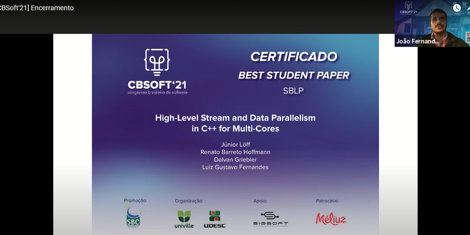 In 2021, the SBLP awards the two best papers, one for each category: student paper and non-student paper. The paper presented by Júnior Löff received the best student paper award at SBLP 2021.