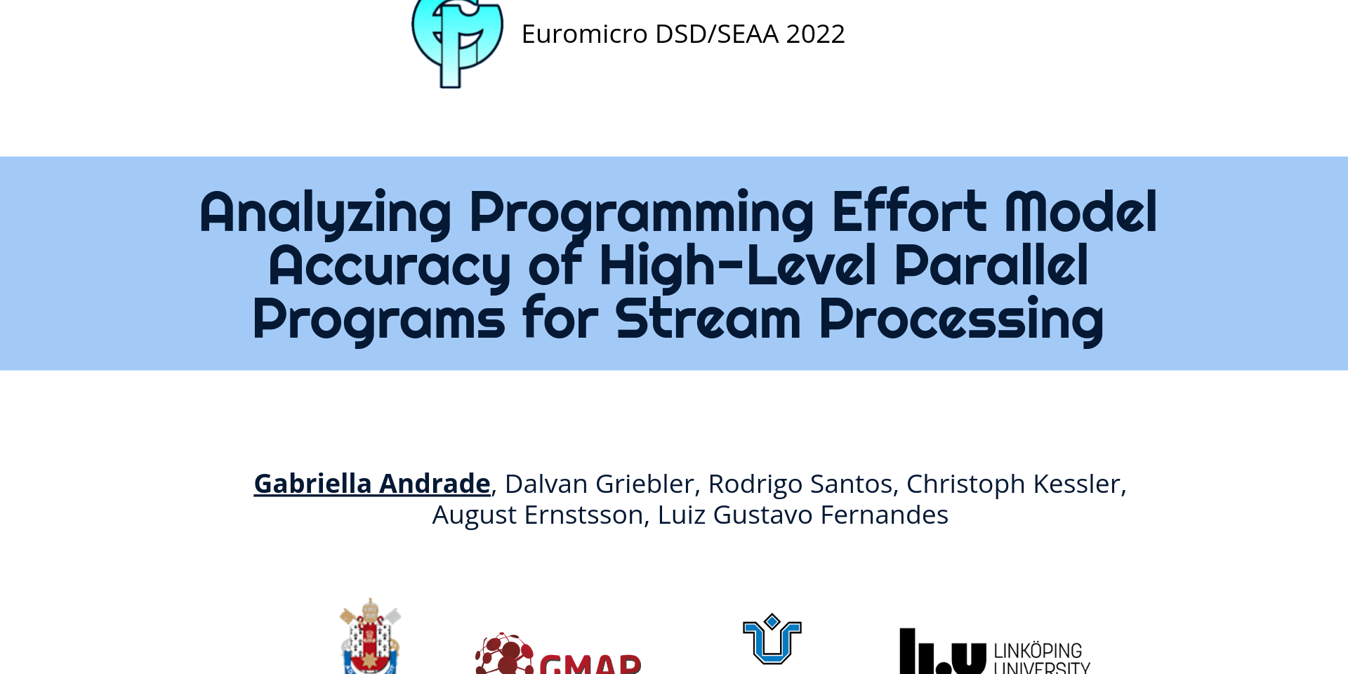 The paper entitled “Analyzing Programming Effort Model Accuracy of High-Level Parallel Programs for Stream Processing” was presented at SEAA 2022 by GMAP Ph.D. student Gabriella Andrade. The work was advised by Dr. Luiz Gustavo Fernandes and co-advised by Dr. Dalvan Griebler. In addition, it had the collaboration of Dr. Rodrigo Santos from UNIRIO, Dr. Christoph Kessler from Linköping University, and Ph.D. student August Ernstsson from Linköping University.