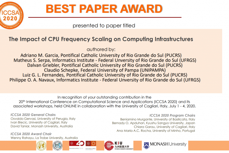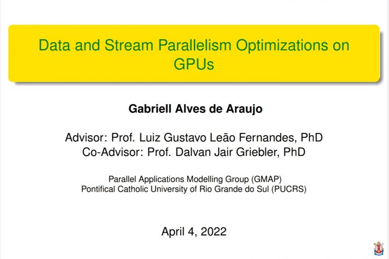 On April 4th, Gabriell Alves de Araujo successfully defended his master’s thesis “Data and Stream Parallelism Optimization on GPUs” at the School of Technology of the Pontifical Catholic University of Rio Grande do Sul (PUCRS). Gabriell is currently a Ph.D. candidate at GMAP. The defense was done through video conference due to the events of…