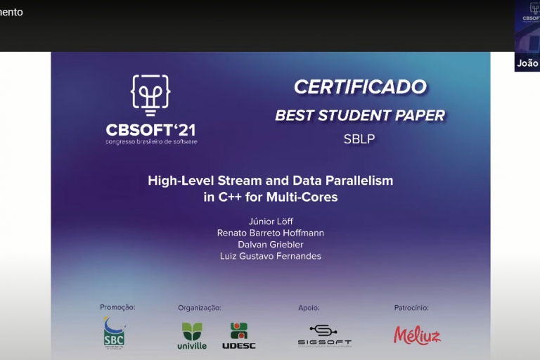 The paper “Stream parallelism annotations for Multi-Core Frameworks” was presented at the 24th Brazilian Symposium on Programming Languages by GMAP member Renato Hoffmann. The event was in a virtual format and the presentation happened at 15:45 on day 19 of October of 2020. The Brazilian Symposium on Programming Languages (SBLP) is a forum for students,…